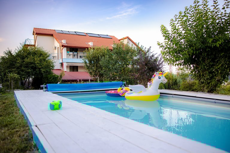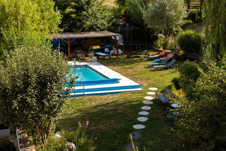 Piscina este dotată cu toate facilitățile pentru a vă asigura confortul și relaxarea de care aveți nevoie. Avem șezlonguri confortabile pentru momente de soare și umbrele pentru protecție, iar apa este întotdeauna la temperatura perfectă pentru a vă bucura de o experiență plăcută. Indiferent dacă vă petreceți o zi de vară activă sau doar doriți să vă relaxați într-un cadru calm și natural, piscina este locul ideal.